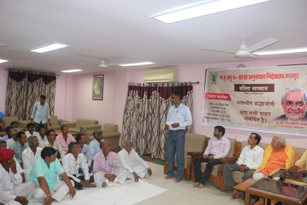 Samaj Sadan, a recreation club of the Directorate of Rapeseed-Mustard Research, Bharatpur organized poetry lessons on Sunday (16-9-2018) for giving fitting tribute on first monthly death anniversary of of Bharat Ratna late Sh. Atal Bihari Vajpayee Ji, former Prime Minister of India. The programme was started by Having a two-minute silence for the peace of the departed soul followed by Director read the introduction of Vajpayee's life, he highlighted his achievements of political carrier, devotion to country and sensitiveness to the society. As well as politicians, Sh. Vajpayee Ji, was a noble person and a great poet. In the poetry annotation, the famous poets of Bharatpur district, Shri Som Dutt Vyas, Shri Ram Babu Bidhohi and Shri Purnan Sharma, through their poems, explained the country proud of Bajpayee's personality. The popular poems composed by sh. Vajpayee ji such as "हार नहीं मानूंगा, रार नहीं ठानूंगा..", "काल के कपाल पर लिखता ही जाता हूँ", etc. were discussed. On this occasion poets read several poems on patriotism. DRMR staff and farmers participated in the programme.The programme was co-ordinated by Dr. Vinod Kumar, Pr. Scientist, in last he stated that great soul never dies, we take inspiration from their lives and recorded hearty thanks to the poets and all participants. Date:2018-09-16 to 2018-09-16  |