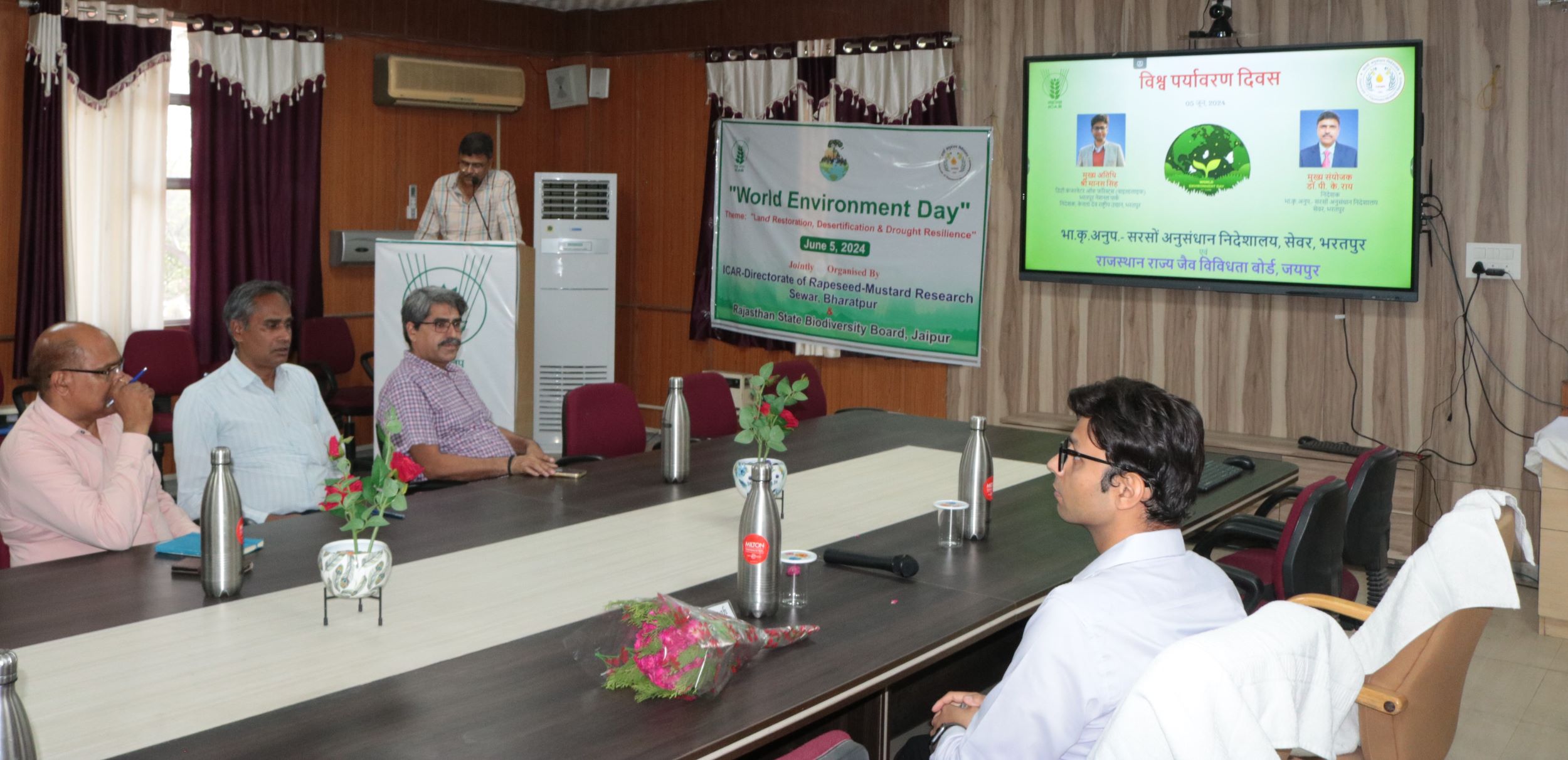 विश्व पर्यावरण दिवस के अवसर पर सरसों अनुसंधान निदेशालय, भरतपुर और राजस्थान राज्य जैव विविधता बोर्ड, जयपुर के सहयोग से एक दिवसीय कार्यक्रम का आयोजन किया गया। इस अवसर पर संस्थान के निदेशक डॉ. पी.के. राय ने अपने संबोधन में पर्यावरण संरक्षण की महत्ता पर जोर देते हुए बताया कि संसाधनों के अंधाधुंध प्रयोग के कारण जलवायु परिवर्तन का खतरा उत्पन्न हो गया है। उन्होंने कहा कि आज के समय में पर्यावरण संरक्षण की आवश्यकता पहले से कहीं अधिक है और हमें मिलकर इसके लिए प्रयास करने की आवश्यकता है। इस कार्यक्रम के मुख्य अतिथि श्री मानस सिंह, डिप्टी कंजरवेटर ऑफ फॉरेस्ट्स (वाइल्डलाइफ), भरतपुर नेशनल पार्क और निदेशक, केवलादेव राष्ट्रीय उद्यान, भरतपुर ने "भूमि पुनर्स्थापन, मरुस्थलीकरण और सूखा सहनशीलता" विषय पर व्याख्यान दिया। श्री सिंह ने अपने व्याख्यान में पर्यावरण संरक्षण के लिए समर्पित प्रयासों पर प्रकाश डालते हुए जलवायु परिवर्तन को रोकने के लिए हो रहे वैश्विक प्रयासों पर चर्चा की। Date:2024-06-05 to 2024-06-05  |